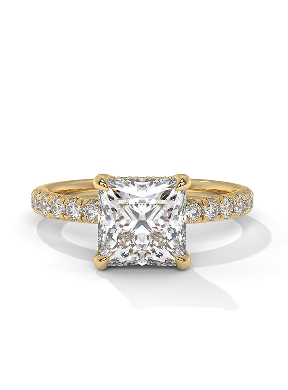 This sophisticated 2.00-carat princess-cut engagement ring features a dramatic four-prong cathedral setting that maximizes light and presence. A shimmering hidden halo and pavé-set bridge add secret brilliance beneath the center stone, visible from every side profile. The design is completed by a delicate pavé-set band, offering a seamless and timeless sparkle that perfectly balances modern lines with classic luxury.