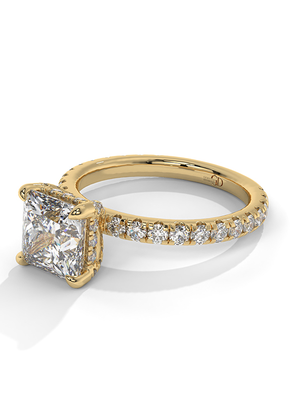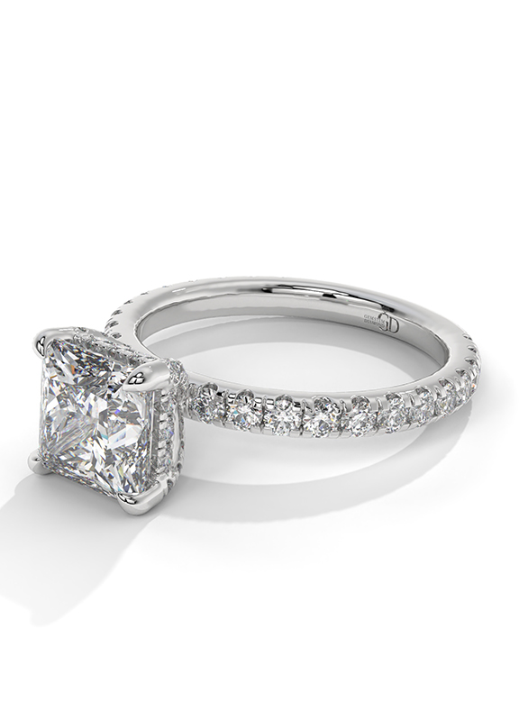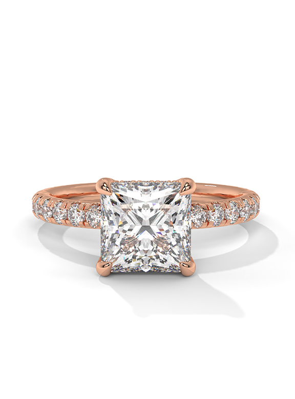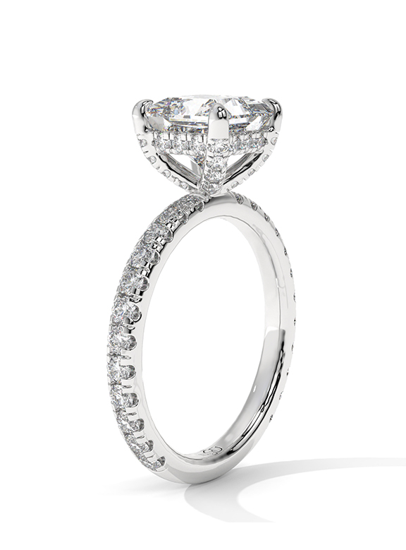 - Setting: Elevated Four-Prong Cathedral with Hidden Halo and Pavé Shank