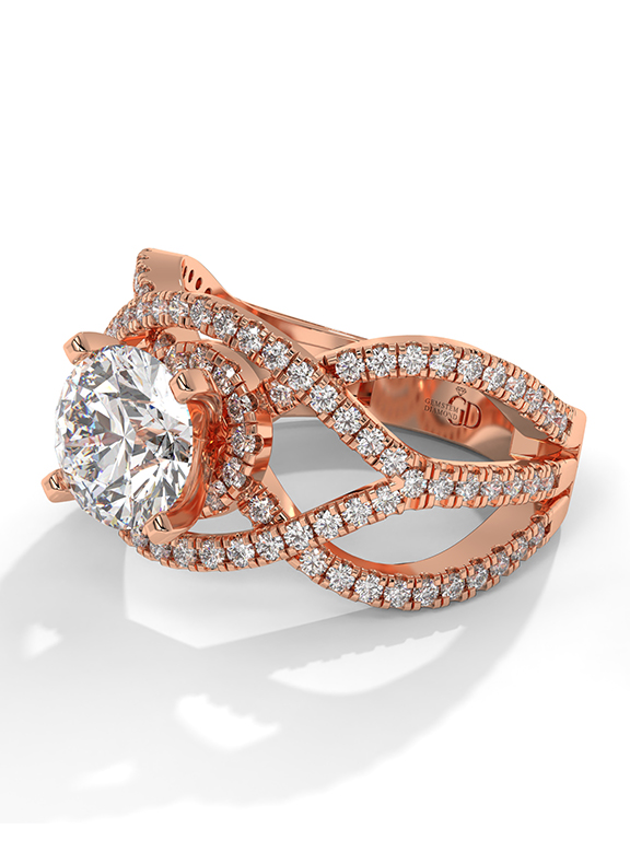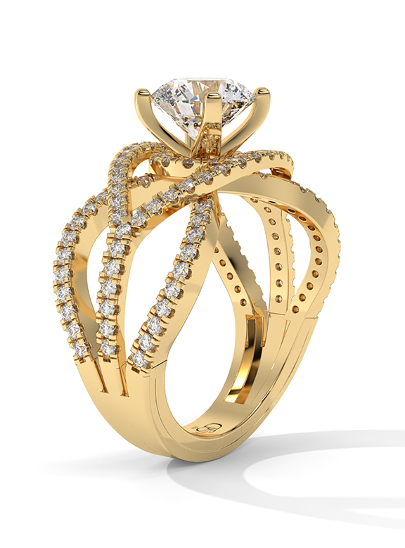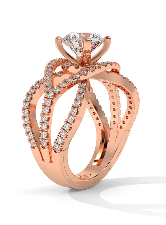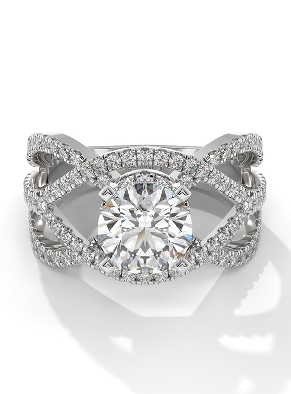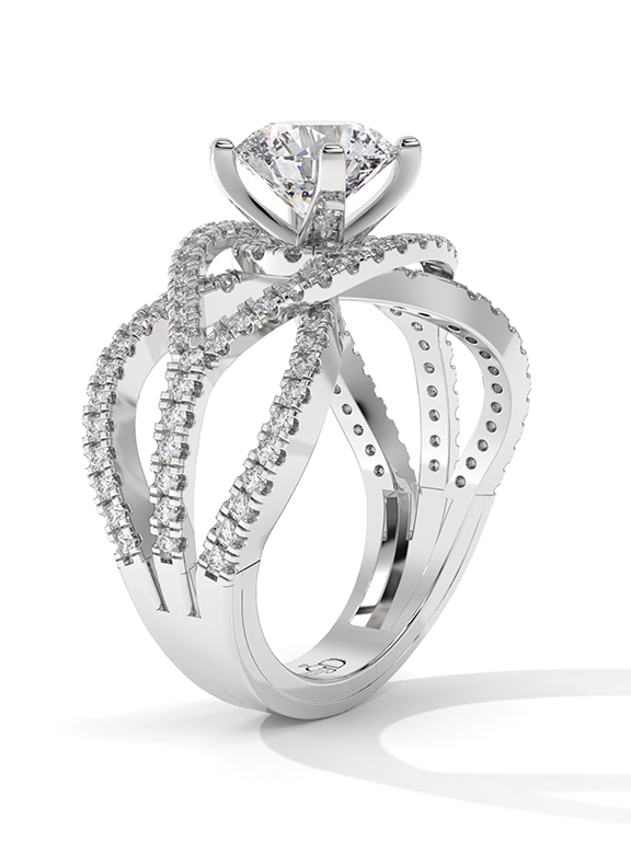 This striking statement ring features a bold architectural design with an intertwining multi-band shank. A 2.00-carat round brilliant-cut center diamond is cradled in an elevated four-prong setting, surrounded by a complex web of pave-set ribbons. The open-work "criss-cross" shoulders create a dramatic, three-dimensional silhouette that balances modern geometry with timeless sparkle.
