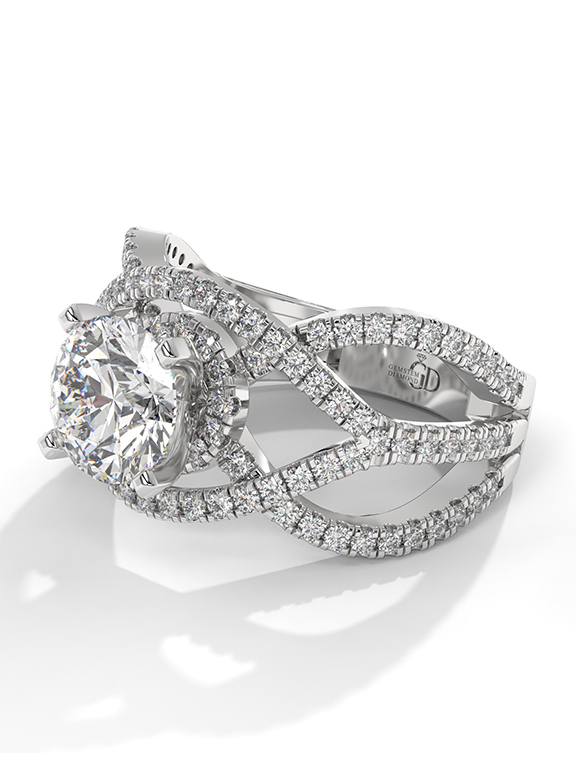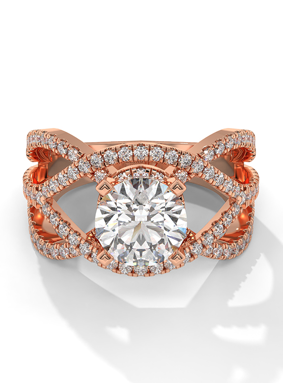 - Setting:Elevated Four-Prong with Interwoven Pave Shoulders