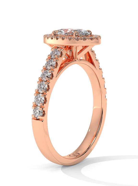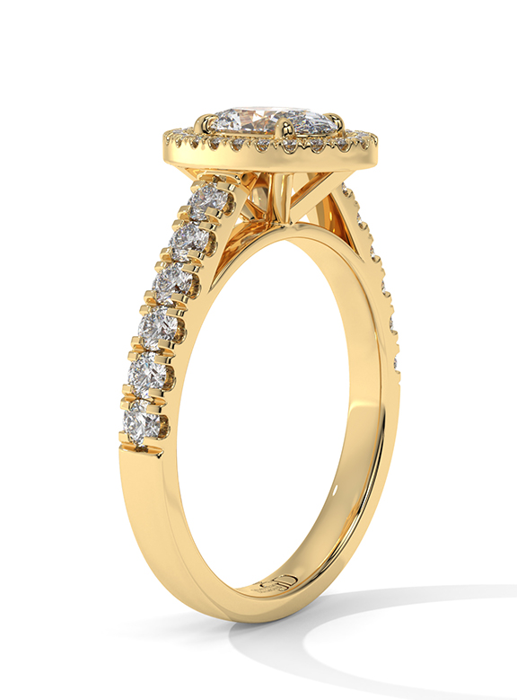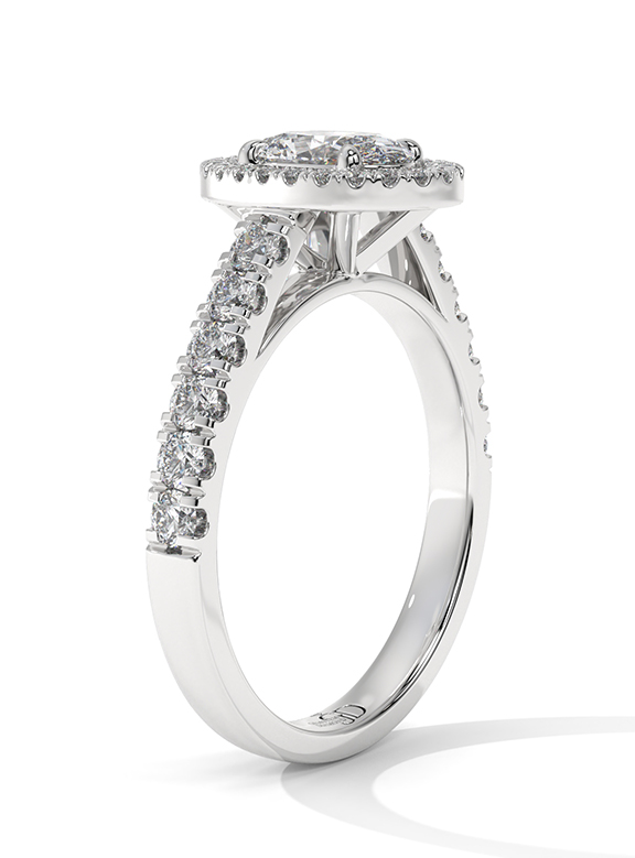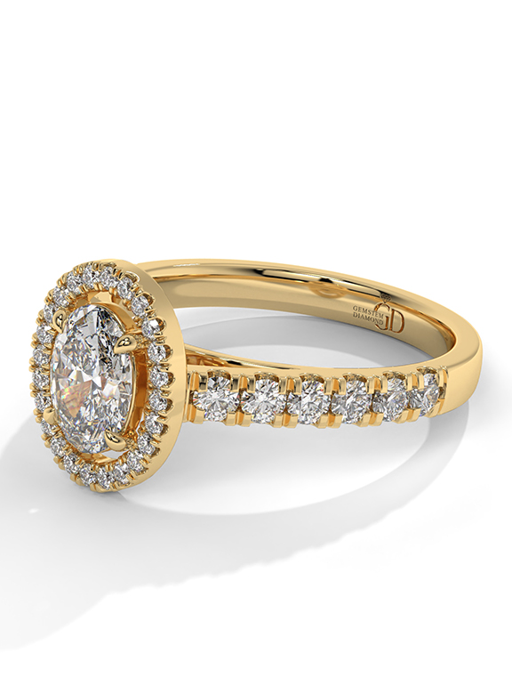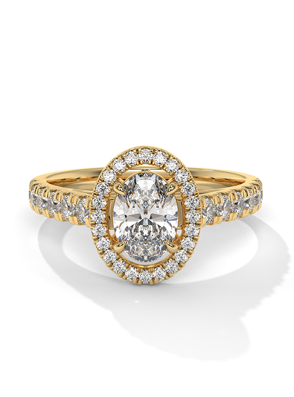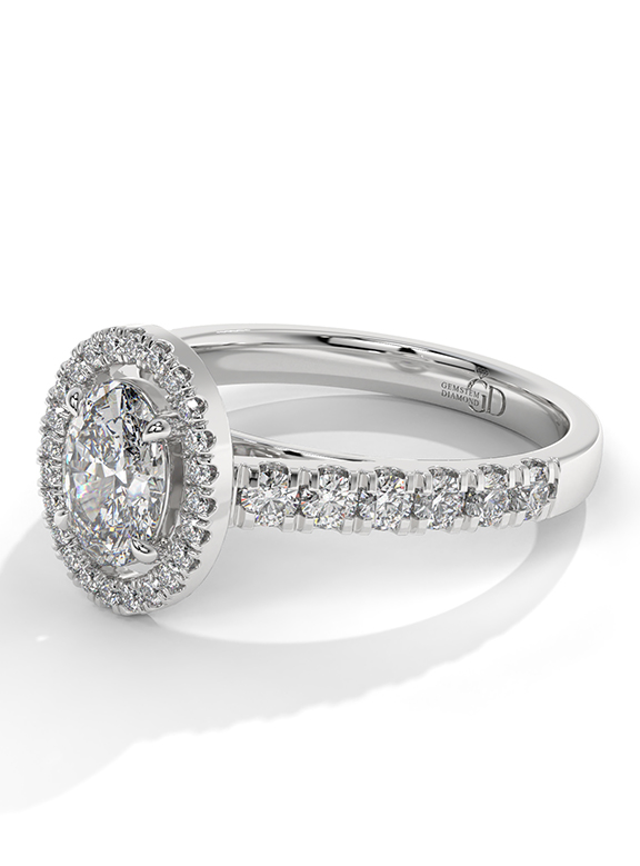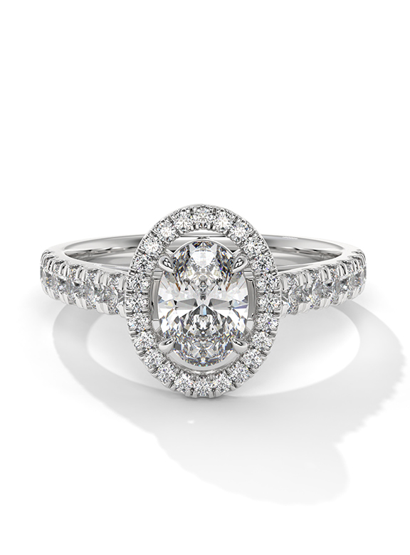 - Setting: Oval Halo with Pave-Set Shoulders and Cathedral Gallery