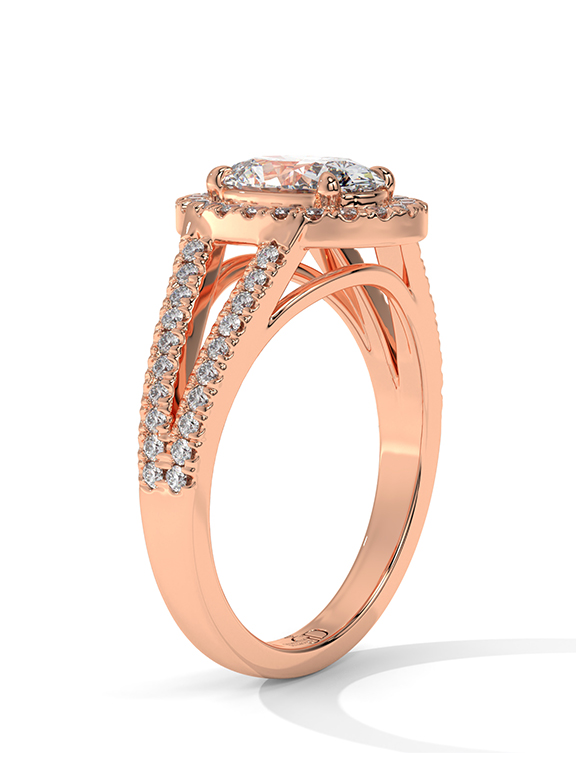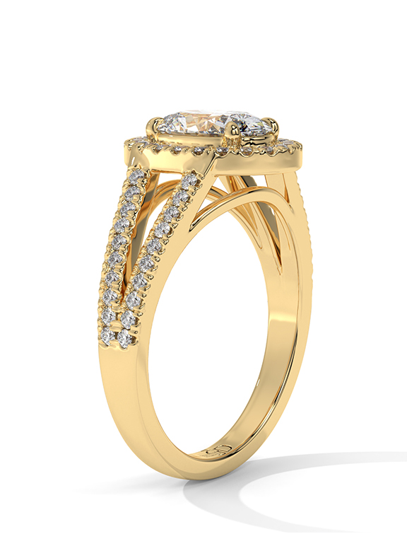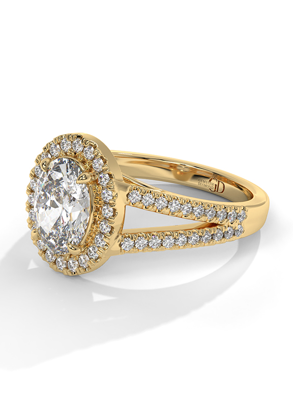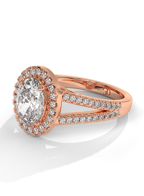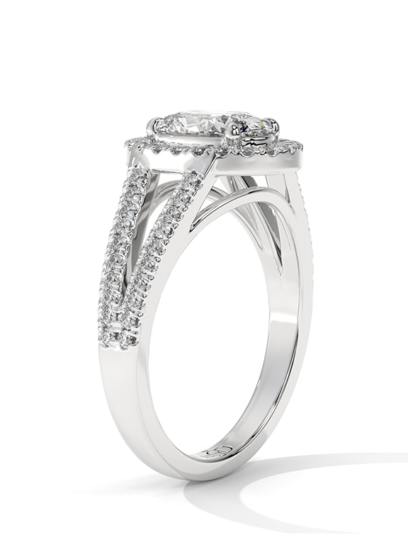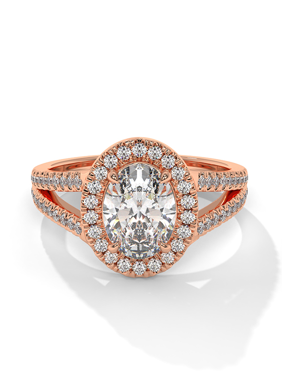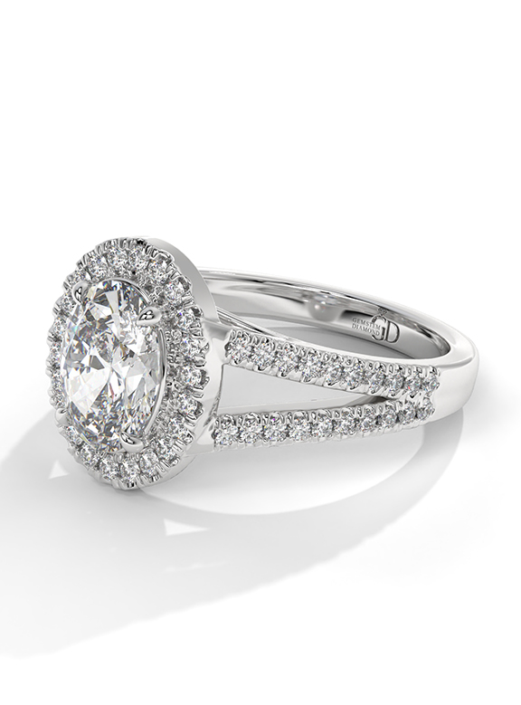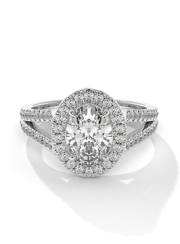 - Setting: Oval Halo with Split-Pave V-Shoulders