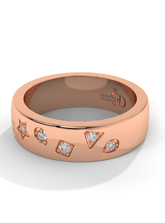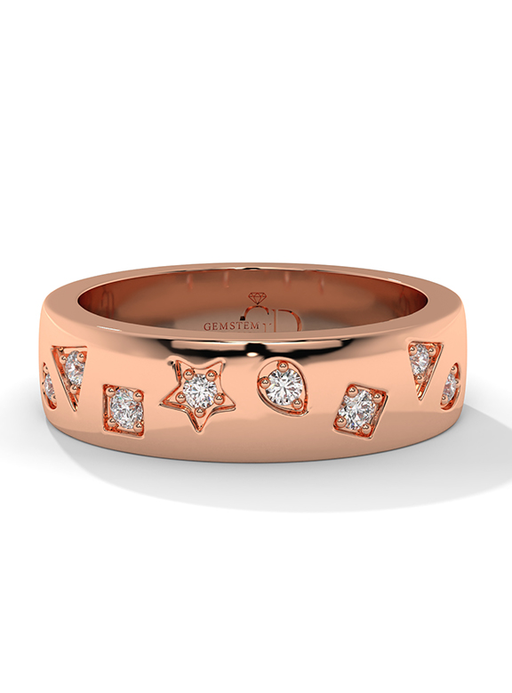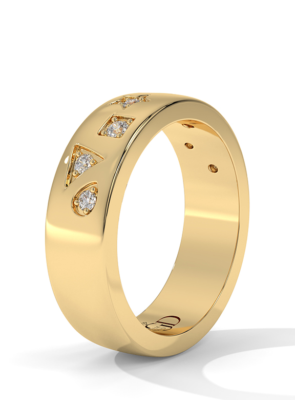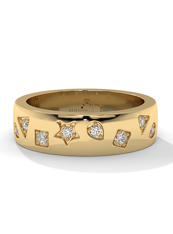 This modern and whimsical wide band offers a celestial-inspired aesthetic, featuring an array of star, square, and teardrop motifs flush-set with shimmering diamonds. The high-polish gold surface is artfully contoured with fluid, organic indentations that create a dynamic play of light and shadow across the band's profile. With a substantial 5.80mm width and a smooth, solid interior, this ring provides a luxurious and comfortable fit while serving as a bold, artistic statement piece.