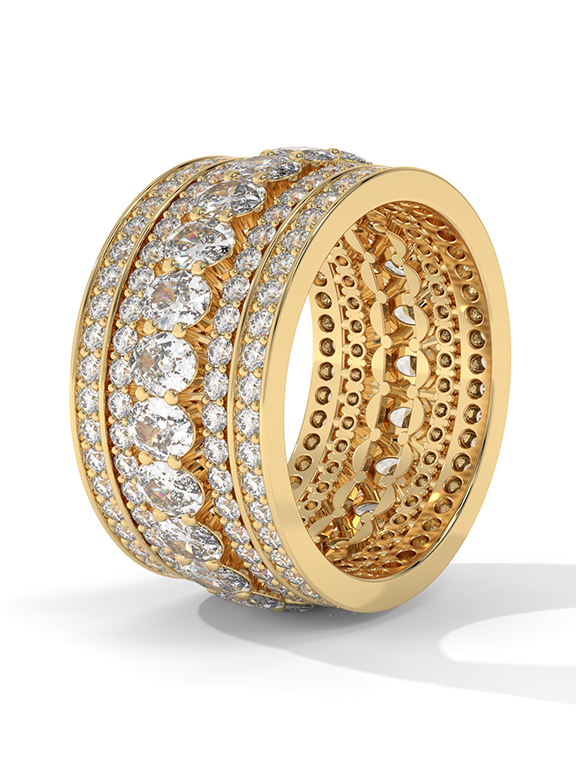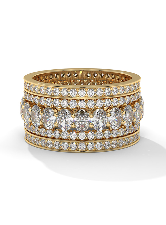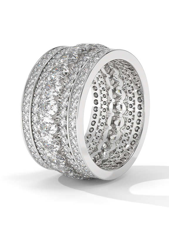 This monumental statement band is a tour de force of high-jewelry craftsmanship, featuring a massive, wide-profile silhouette that commands attention. The design centers on a rhythmic row of 23 stunning oval-cut diamonds, meticulously set into the middle of the band. This central "river" of brilliance is flanked by multiple parallel rows of round brilliant-cut diamonds, creating a multi-tiered pave effect that extends across the entire surface of the ring. The substantial, architectural build of this piece offers a heavy, luxurious feel, making it an ideal choice for a grand celebration or a high-fashion accessory.