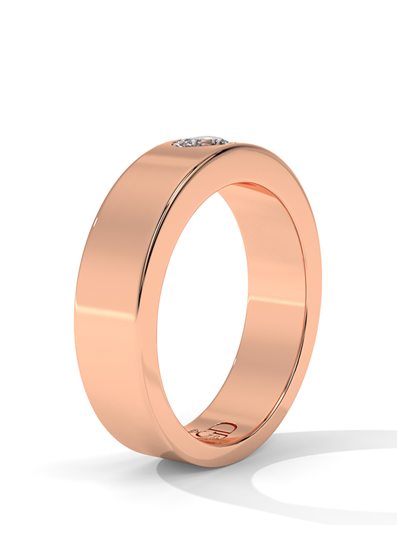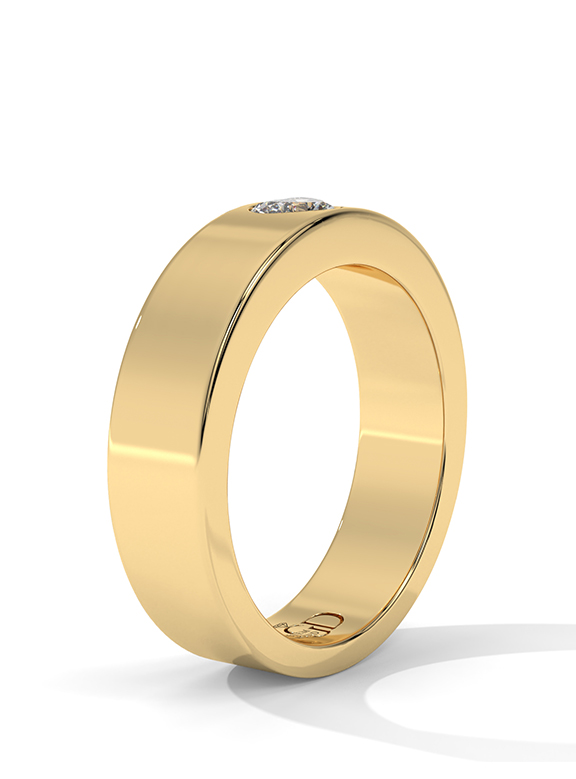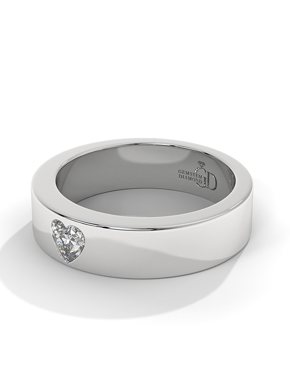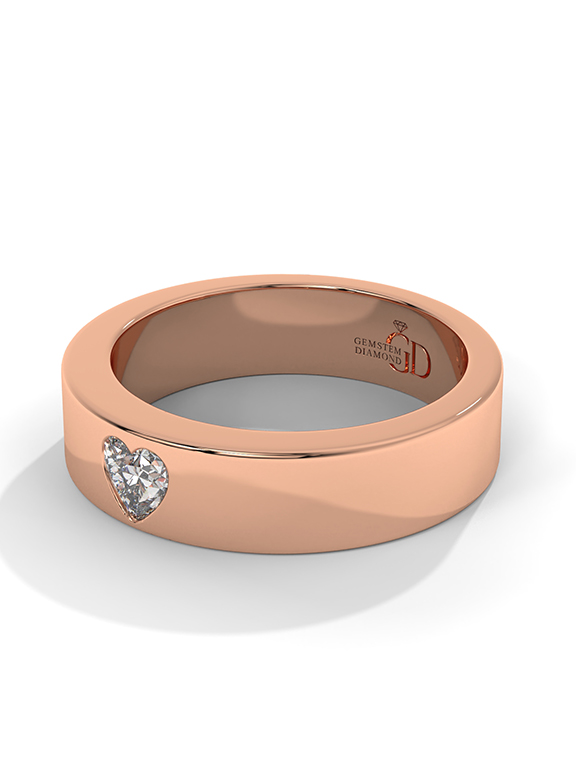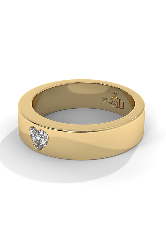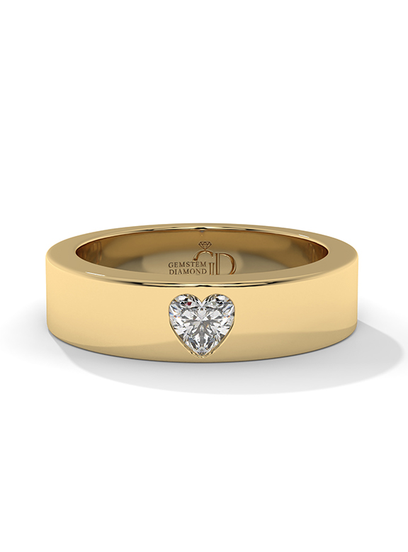 This refined unisex band offers a modern and minimalist aesthetic, focusing on clean lines and a singular, heartfelt detail. The flat-profile shank is meticulously crafted in high-polish gold, providing a smooth and comfortable fit. At its center, a delicate 0.25-carat heart-shaped diamond is flush-set, creating a subtle yet profound statement of love that rests perfectly level with the band's surface.
