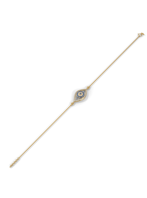 This mystical evil eye charm bracelet is a masterclass in symbolic luxury, featuring a central almond-shaped motif meticulously pave-set with shimmering white diamonds and deep-blue sapphires for brilliance from every angle. The architectural charm is supported by an elegant, high-polish fine link chain designed for a continuous flow of radiance. This exquisite design is finished with a classic spring-ring clasp and adjustable sizing links, offering a perfect blend of protective opulence and daily comfort.