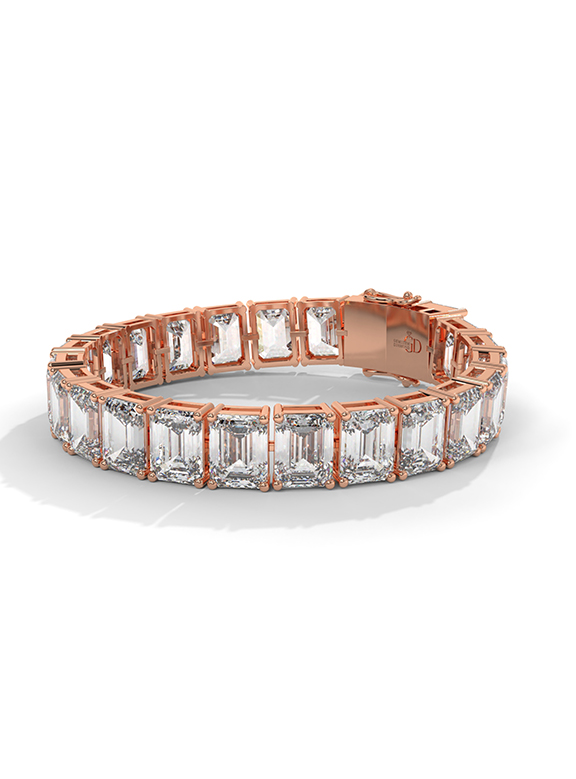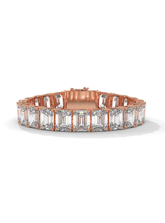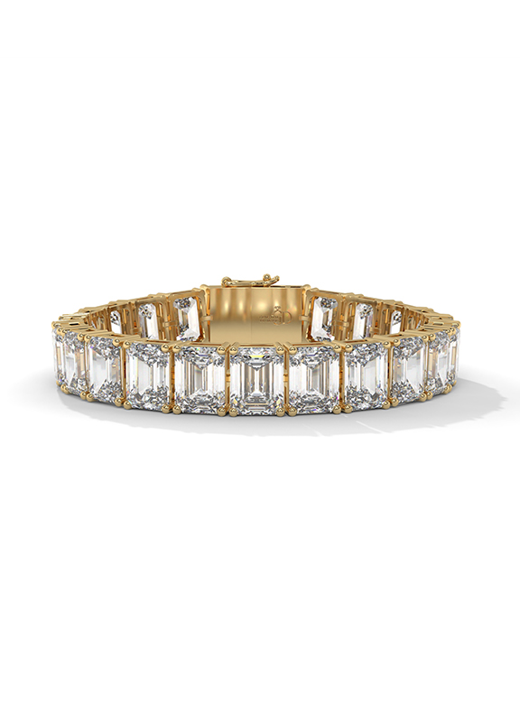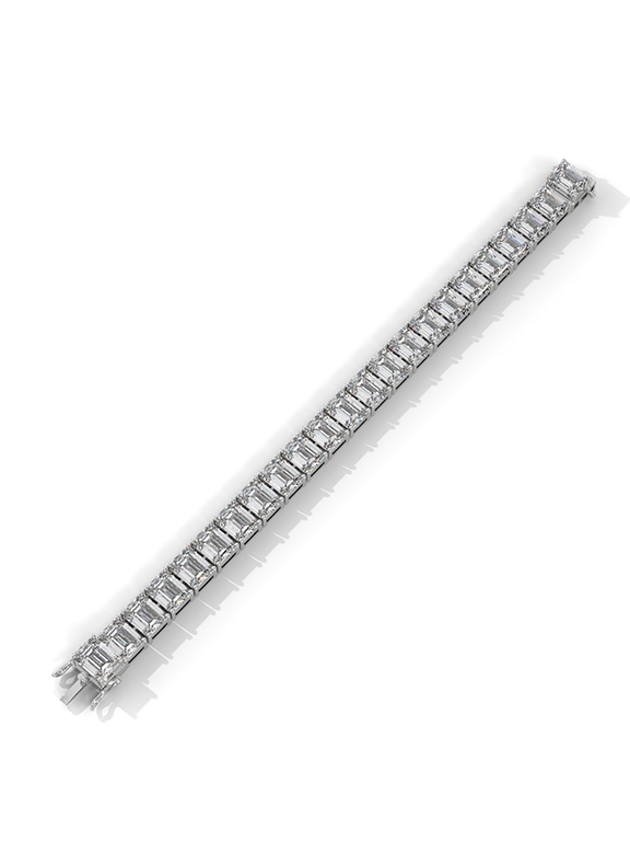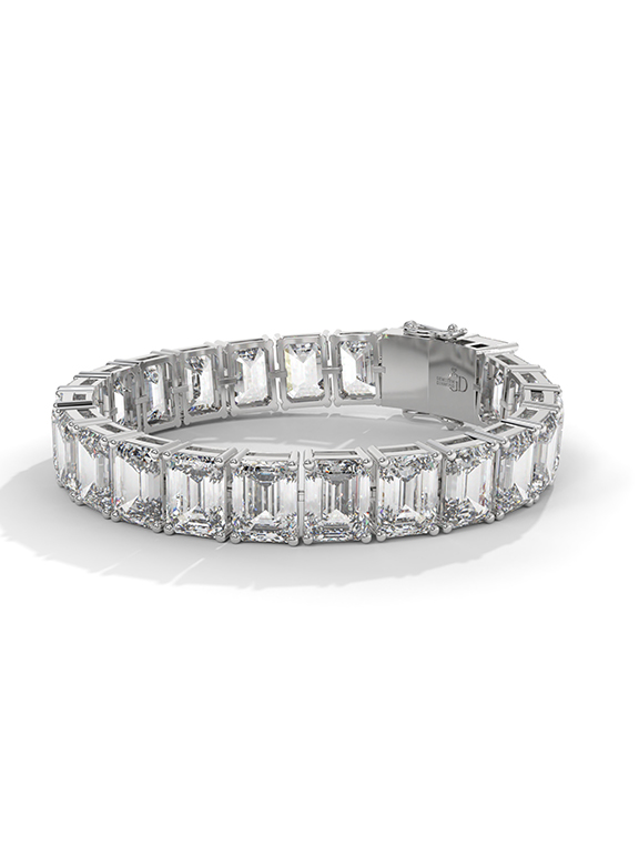 This magnificent 57.50-carat emerald-cut tennis bracelet is a masterclass in light and luxury, featuring twenty-three high-clarity emerald-cut stones meticulously set in a continuous row for brilliance from every angle. The architectural silhouette is supported by an elegant four-prong setting for each individual link, offering a sophisticated and timeless aesthetic. This exquisite design is finished with a secure box clasp and safety latch, providing a perfect blend of high-end opulence and daily comfort.