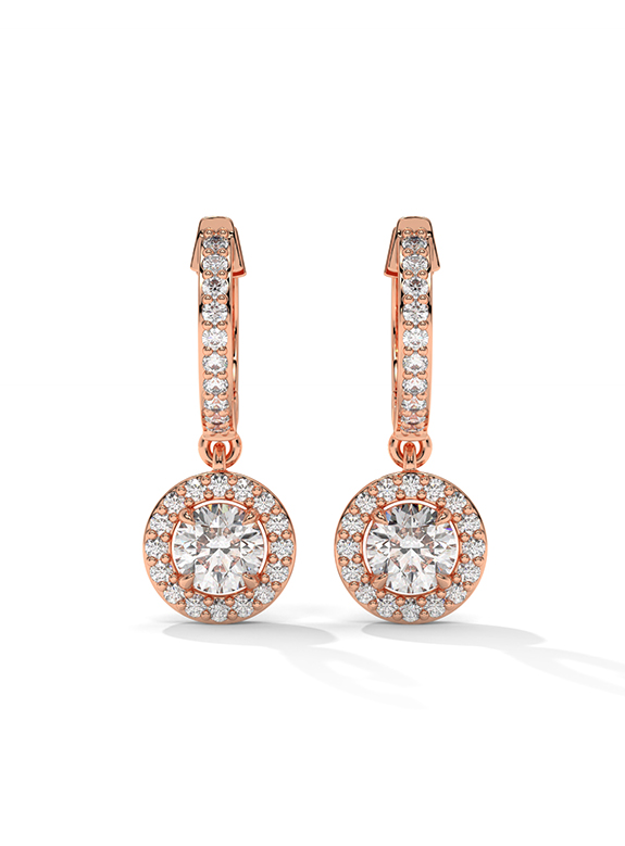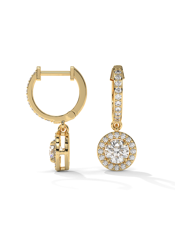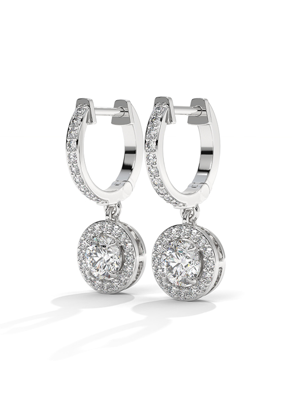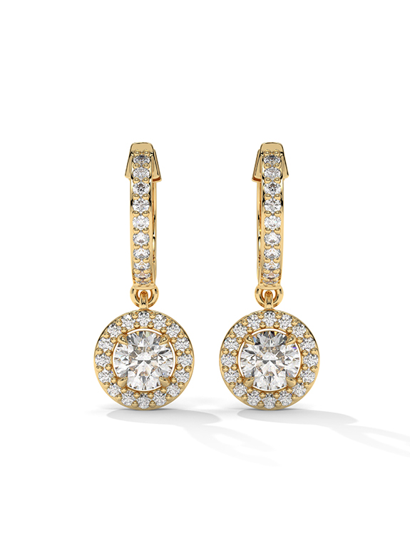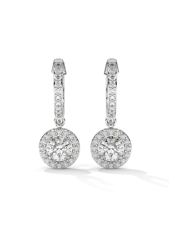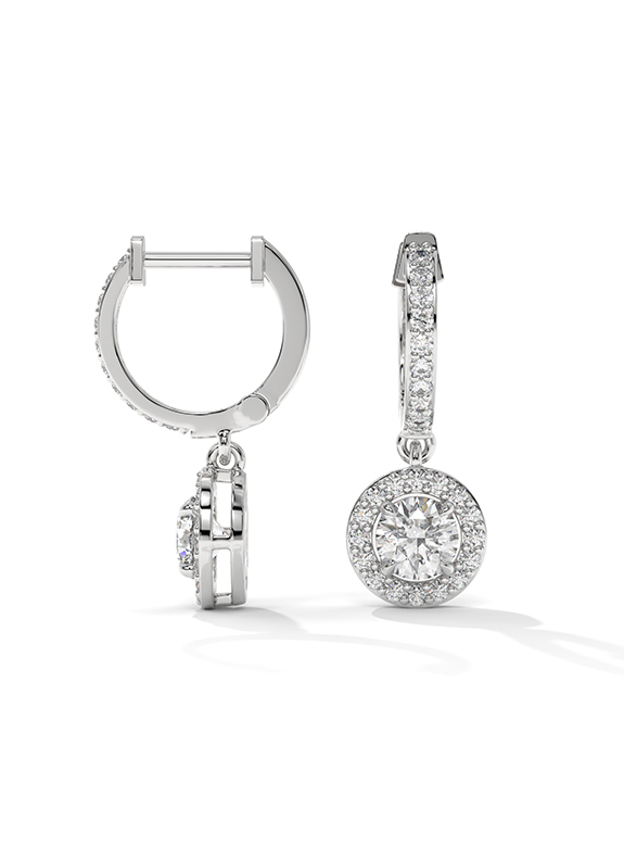 These breathtaking round brilliant halo drop earrings are a masterclass in light and luxury, featuring two shimmering center stones encircled by a delicate halo of pave diamonds for brilliance from every angle. The architectural design features a classic huggie-style hoop pave-set with diamonds, supporting an elegant dangling halo charm. This exquisite design is finished with a secure hinged closure, offering a perfect blend of opulence and daily comfort.