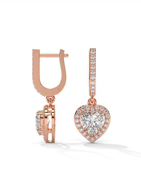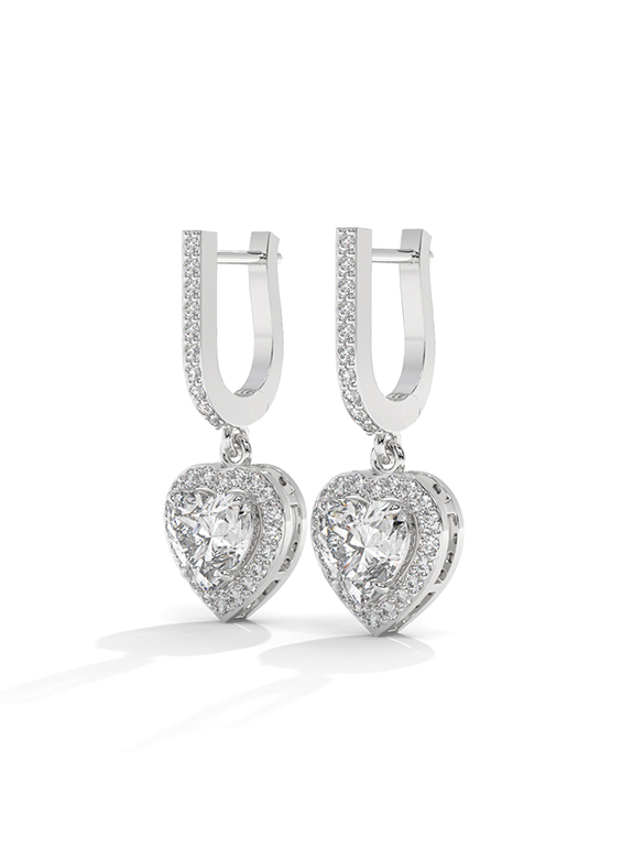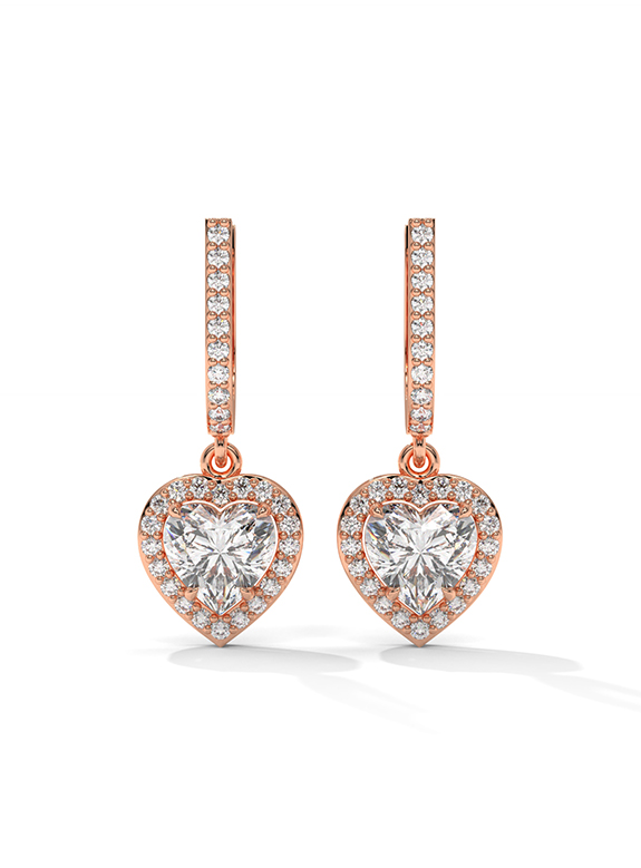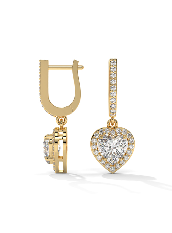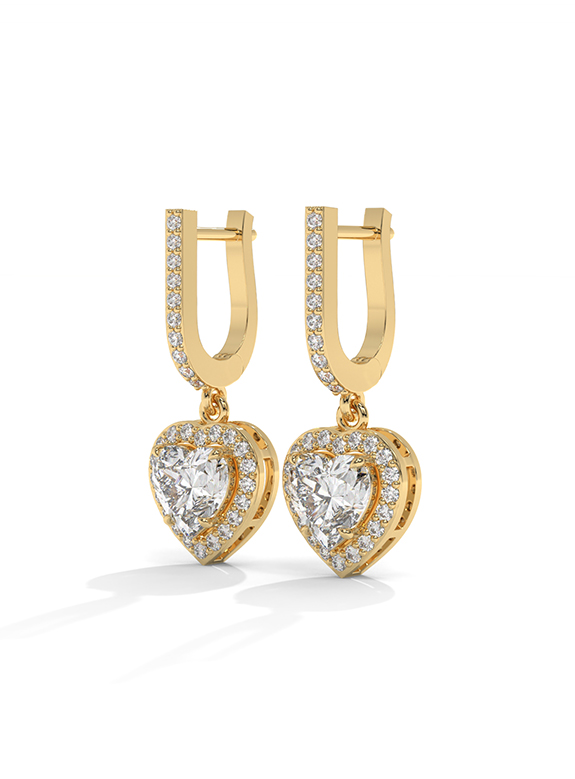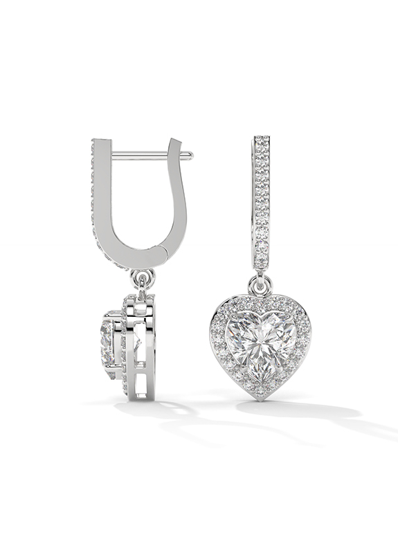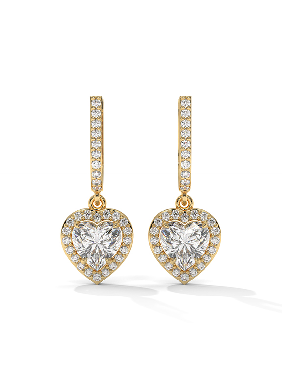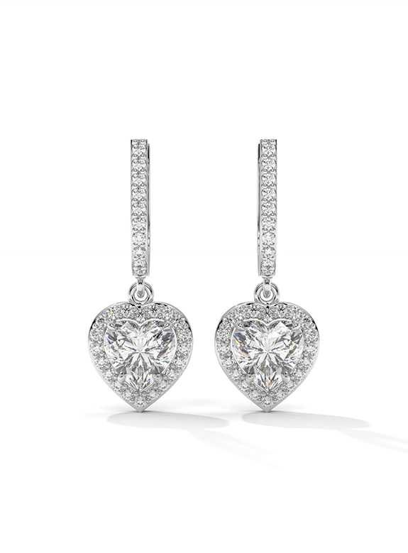 These breathtaking heart-cut halo drop earrings are a masterclass in light and luxury, featuring two romantic heart-shaped center stones encircled by a shimmering halo of pave diamonds for brilliance from every angle. The architectural design features an elegant huggie-style hoop meticulously pave-set with diamonds, supporting a dangling heart halo charm. This exquisite design is finished with a secure hinged closure, offering a perfect blend of sentimental opulence and daily comfort.